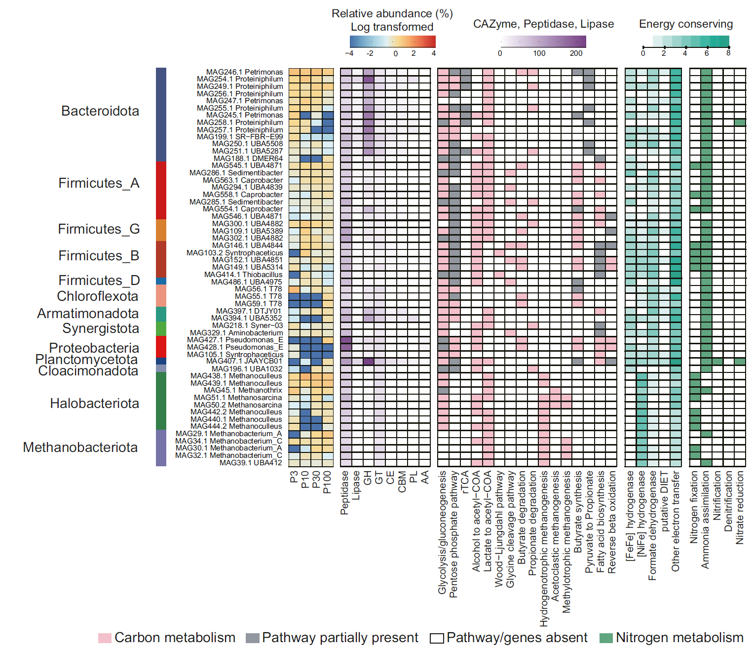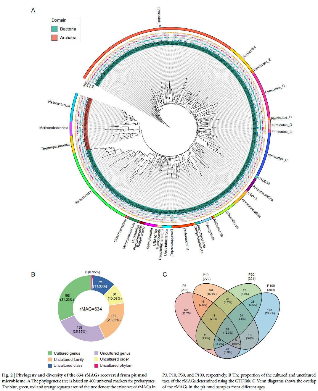 该项研究通过对120个不同窖龄(3年至100年)窖泥样本的深入分析,重构了634个代表性组装基因组(rMAGs),发现窖泥微生物中约70%的物种为未培养新物种,展现了窖泥作为历经岁月积累的 “微生物资源宝库”资源挖掘的巨大潜力,为后续资源开发提供了广阔空间。