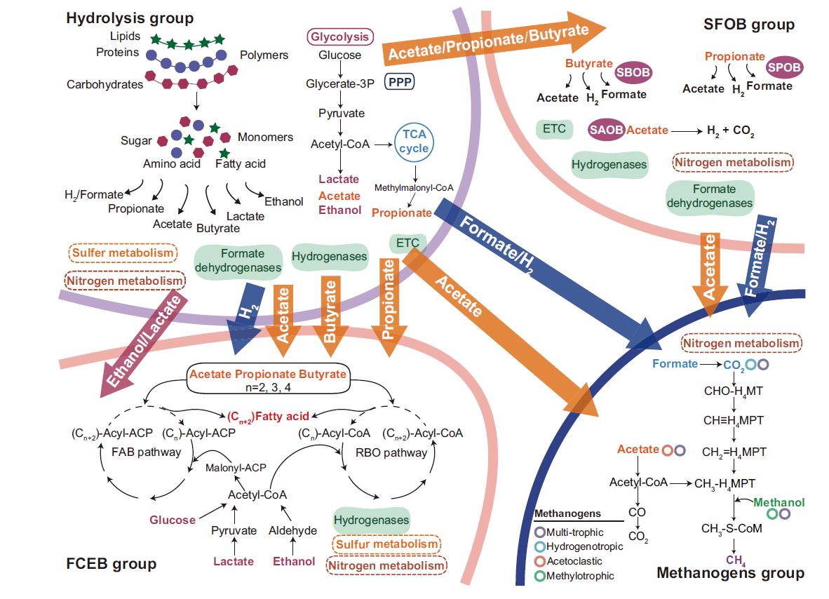 4、提出了窖泥中四类功能菌群模型:以降解聚合物为单体的水解菌群,将短链脂肪酸转化为贡献酒体风味的更长链脂肪酸(如己酸)的脂肪酸链延长菌群,与产甲烷菌耦合氧化SCFAs生成CH₄且维持系统稳定性的互营氧化菌群,以及协同去除H₂且防止酸积累的产甲烷菌群。