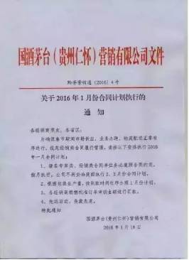 1月18日,茅台营销有限公司发布《关于2016年1月份合同计划执行的通知》。通知内容如下: