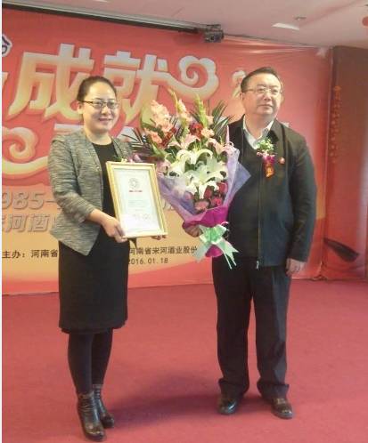 (王祎杨总裁代表宋河酒业接受河南省酒业协会的表彰,两人共同展示“1985-2015中国白酒历史标志性产品”奖牌)