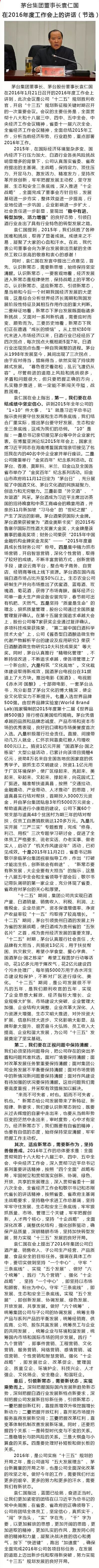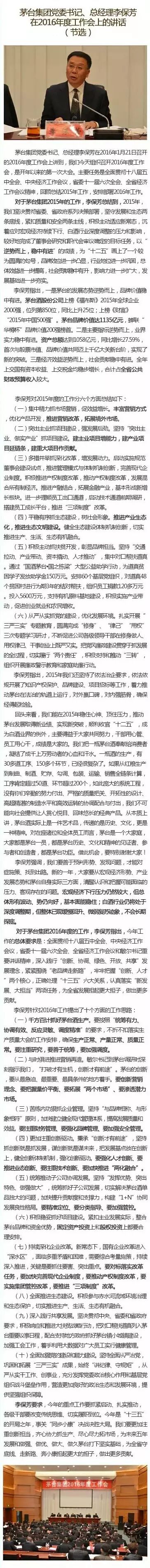 同时,茅台集团总经理李保芳在茅台2016年度工作会上,从“六大方面”重点总结茅台2015年工作,又在“十个方面”安排部署2016年工作思路。