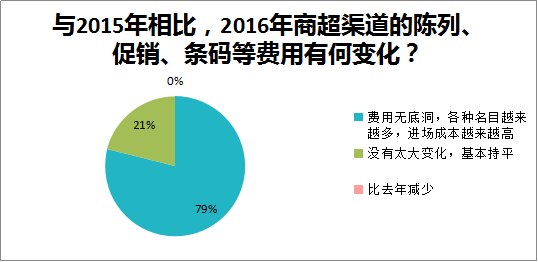 做商超,最头疼的就是费用。条码费、进场费、陈列费、赶上卖场大促还得贴促销费。从调查的结果来看,这些费用明年也不会减少,甚至只会越来越高。对经销商来说,这样的费用真是一个人承受不来,如果厂家不支持,商超可能就是赔本的买卖。