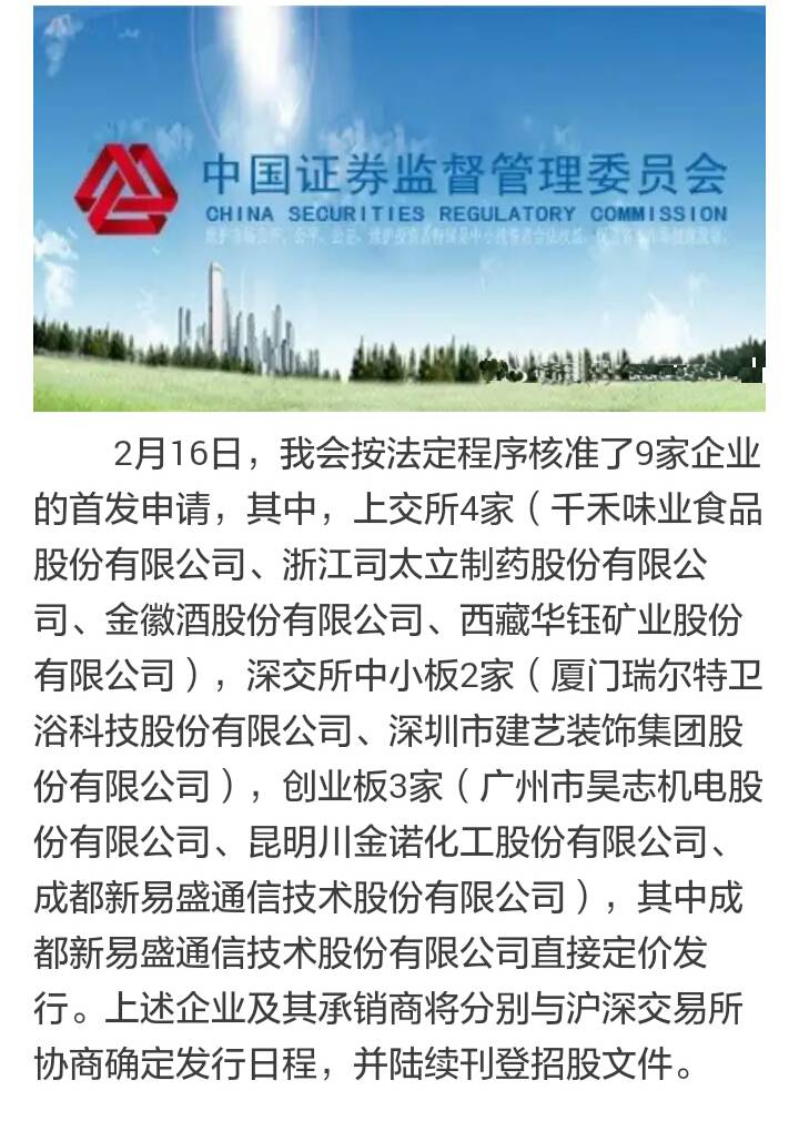 2月16日,证监会发布IPO公告称,按照法定程序核准了包括金徽酒股份有限公司在内的9家企业的首发申请。