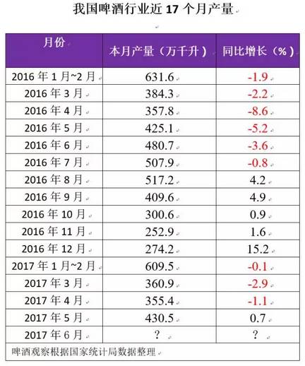 2017年1-5月,中国啤酒行业累计产量1758.7万千升,同比下降0.7%。其中,5月份,我国啤酒行业产量430.5万千升,同比增长0.7%,为今年首个增长月。