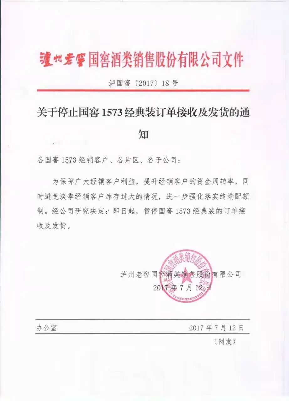 2017年7月12日,泸州老窖国窖酒类销售股份有限公司向各经销客户、各片区、各子公司,下发《关于停止国窖1573经典装订单接收及发货的通知》称,