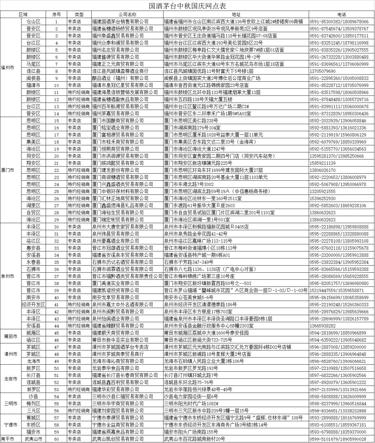 2017年8月6日,贵州茅台酒销售有限公司福建省区和国酒茅台福建省经销商联谊会共同公示了福建省茅台酒指定购买网点名单。国酒茅台福建省联谊会声明:至今日起,这些被公布的网点必将最大程度满足社会消费者对茅台酒的购买需求。