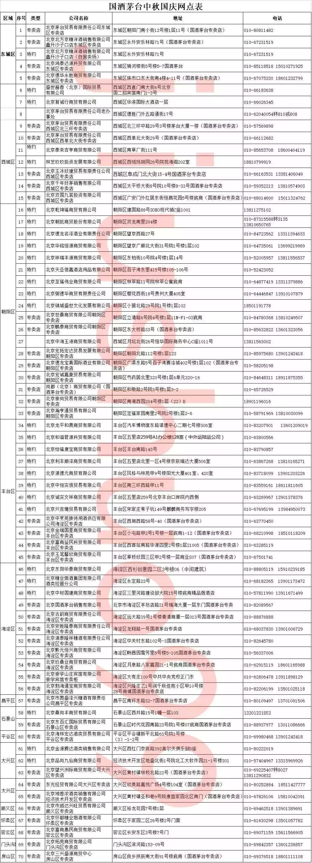 8月5日,酒说拿到独家报料,茅台公司北京片区和国酒茅台北京联谊会共同公示了北京地区70家茅台酒中秋国庆指定购买网点名单!双方声明,双节期间,这70家被公布的网点将拿出50%的供货量来确保零售,最大程度满足社会消费者的茅台酒购买供应,并且一律以1299元的价格出售茅台酒!如消费者在公示的网点买不到茅台酒,将接受处罚,除此之外,北京市商超零售超过百家网点也加入了平价卖酒活动。公开接受社会监督。监督电话是:010-82089567,13801214191。
