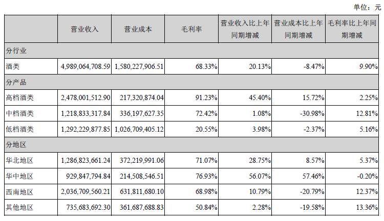 从产品结构来看,上半年高档酒实现24.78亿收入,同比增长45%;中档酒实现12.18亿收入,同比收入基本持平;低档酒博大系列经过上半年总体调整,二季度调整结束后呈现增长。从区域来看,西南区域体量最大,上半年实现20亿收入,增速约10.8%,华北地区实现28.7%的增长,收入达12.7亿元;华中地区增速最快,增速达56%,实现9.3亿收入。