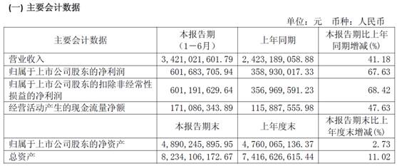 8月25日,山西杏花村汾酒厂股份有限公司发布上半年业绩报告称,2017年1—6月公司实现营业收入34.21亿元,同比增加41.18%;实现归属于上市公司股东的净利润6.02亿元,同比增加67.63%。