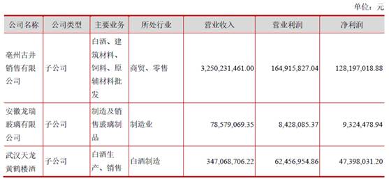 对于古井贡酒来说,作为核心的酒类销售子公司,亳州古井销售有限公司实现营业收入32.5亿,净利润1.28亿;武汉天龙黄鹤楼酒业有限公司实现营业收入3.47亿,净利润4740万。