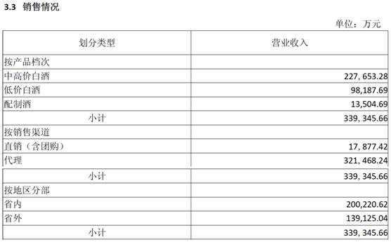 在具体销售中,汾酒的中高价白酒实现营收22.77亿元,占总体营收的67.1%;按销售渠道,代理渠道实现营收32.15亿元;省内市场贡献营业收入20亿,省外市场贡献13.91亿元。