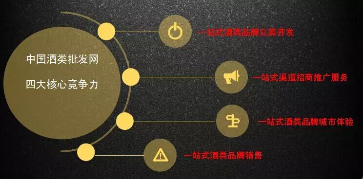 中国酒类批发网拥有大量一线活跃的生产厂家,经销、加盟商数据库和寻找对口项目的经销商和加盟商人群,是一站式酒类品牌发展平台;通过中国酒类批发网强大的媒体资源,节约广告媒体成本,同时将品牌在瞬间推向全国各地,是一站式渠道招商推广服务平台;通过数十万经销商会员和数百万终端客户销售动态数据库,联合全国经销商精准定位预开发产品,集聚众人之力,创造更大价值,也是一站式酒类品牌众筹开发平台;线下线下双轨运行,线上线下同步推广,实现真正的品牌新品一夜开花,铺满全国,因此,它也是一站式酒类品牌城市体验平台。这也是中国酒类批发网的四大核心竞争力!