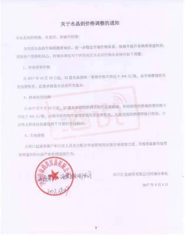 9月11日,酒说记者获悉了一份《关于水晶剑价格调整的通知》: