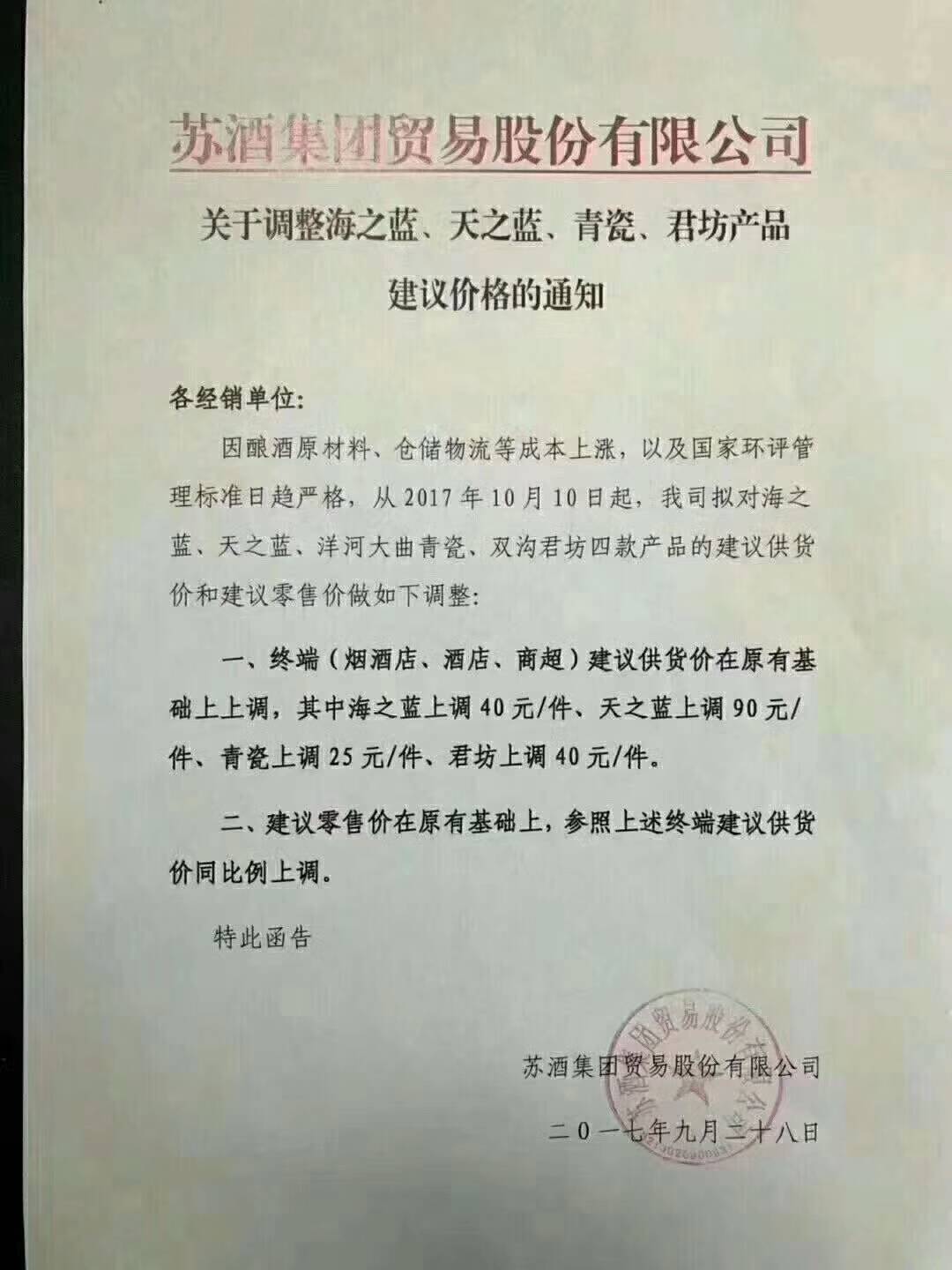 各经销单位:因酿酒原材料、仓储物流等成本上涨,以及国家环评管理标准日趋严格,从2017年10月10日起,我司拟对海之蓝、天之蓝、洋河大曲青瓷、双沟君坊四款产品的建议供货价和建议零售价做如下调整: