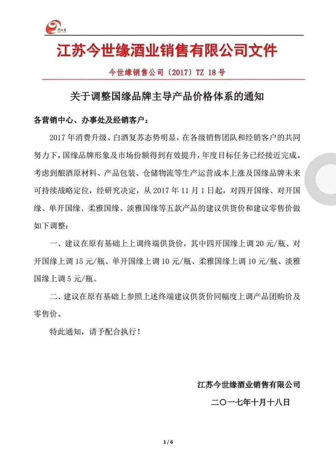 10月21日,酒说记者获悉,江苏今世缘酒业销售有限公司向各营销中心、办事处及经销客户下发了《关于调整国缘品牌主导产品价格体系的通知》。核心内容为: