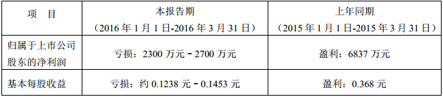 兰州黄河2016一季度预亏2300万元—2700万元