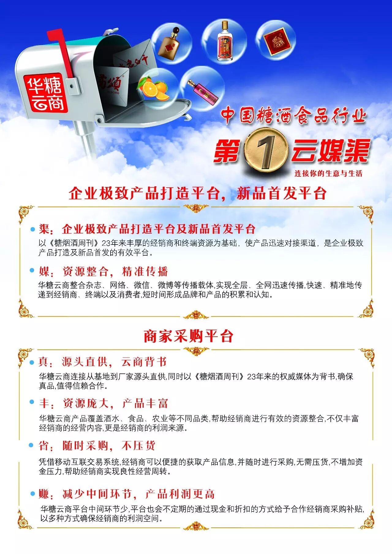华糖云商依托《糖烟酒周刊》23年的行业资源致力于借助互联网工具进行社会营销工程建设。通过整合糖酒食品行业乃至大农业产业资源,将上游厂家,下游商家,终端消费者以及传播载体连接在一起,发挥自身产品设计、传播推广、招商销售优势,建立移动互联时代B TO B TO C的生态平台,为每一个连接节点创造商业价值,满足企业引爆式传播需求,为广大经销商和消费者提供源源不断的极致单品。