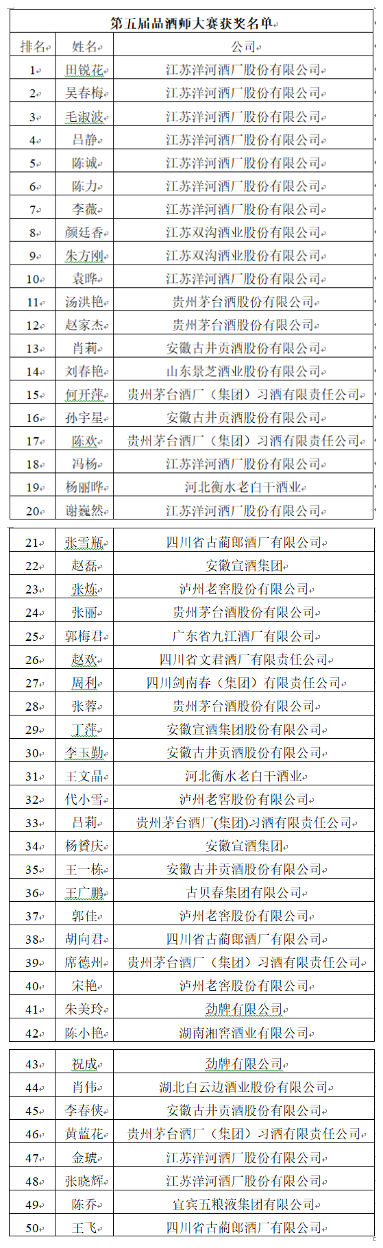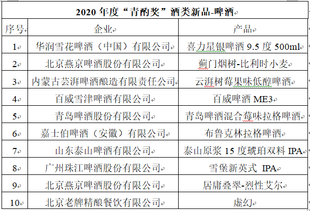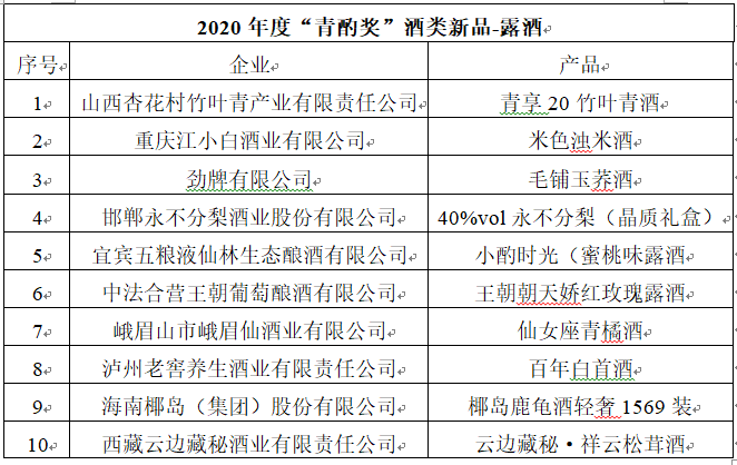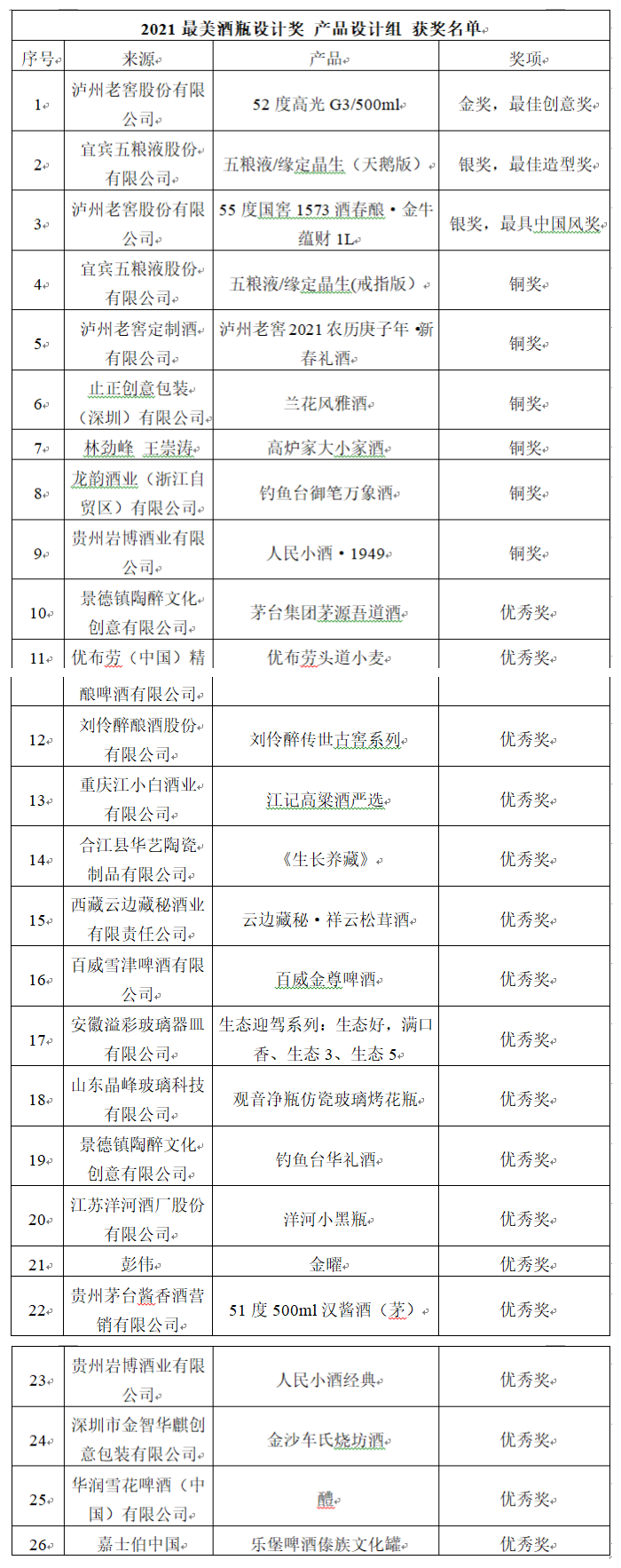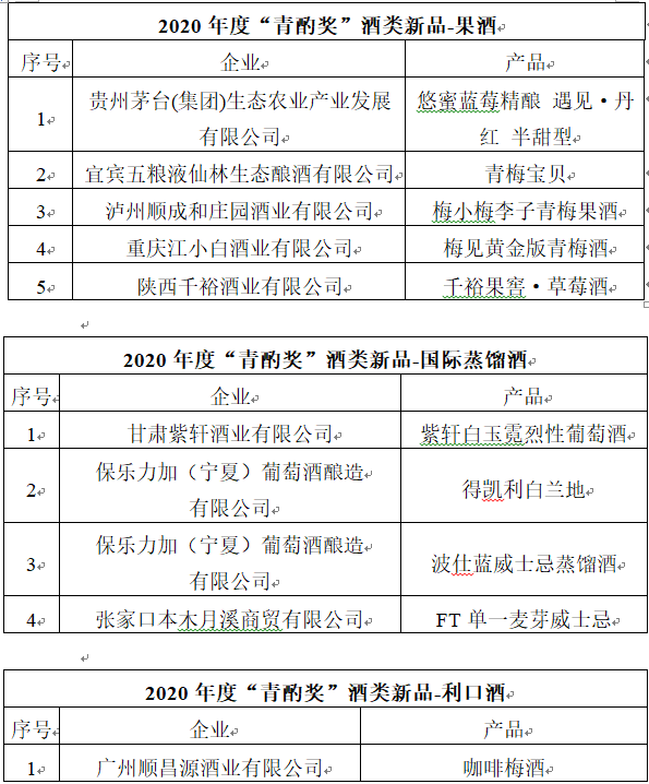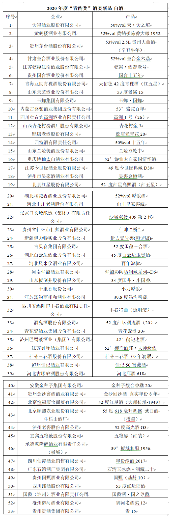 盛典现场揭晓了三项赛事的获奖名单并进行了盛大的颁奖仪式。2020年度“青酌奖”酒类新品共有103款,其中近一半为白酒新品。最美酒瓶设计大赛的最佳创意奖和最具中国风奖分别被泸州老窖股份公司的52度高光G3/500ml和55度国窖1573酒春酿·金牛蕴财1L斩获,五粮液股份公司的五粮液/缘定晶生(天鹅版)则获得最佳造型奖。经过激烈的比拼和公正的评选,第五届全国品酒师大赛的前三甲均被江苏洋河酒厂股份公司收入囊中。