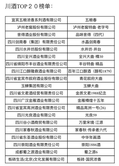 川酒TOP20榜单: