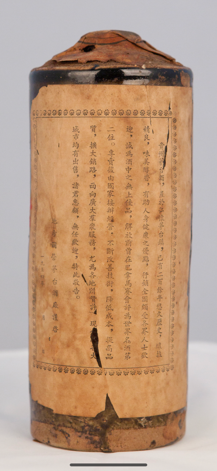 介绍:藏品为外销新加坡的回流产品,瓶身繁体貴、草字头苔,背标印一九五四年,盖纸贴有当年出口到新加坡的标签。作为收藏界目前较早的一瓶贵州茅台酒,它见证了一段鲜为人知的茅台酒发展史。