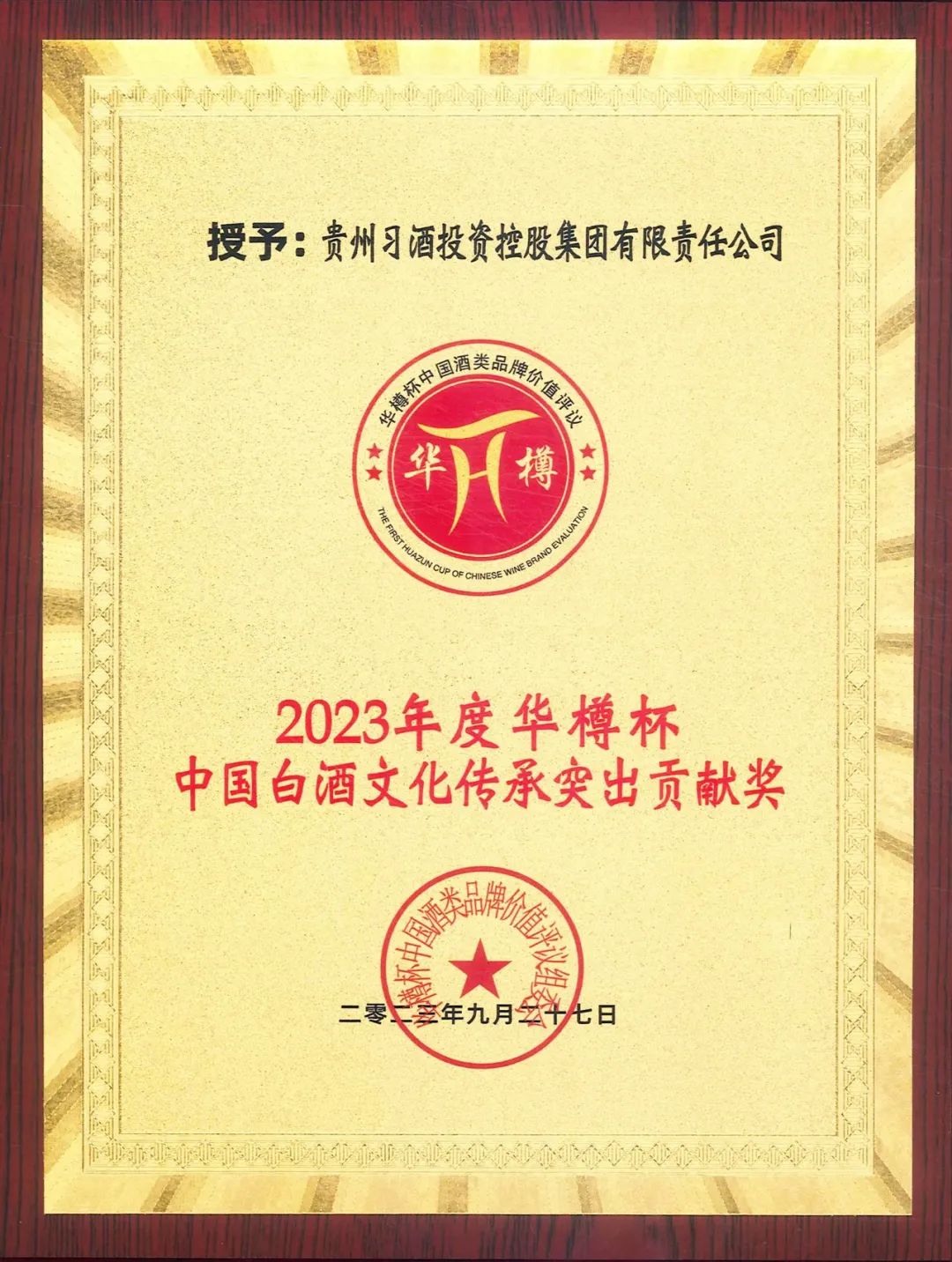 ▲贵州习酒荣获“2023年度华樽杯中国白酒文化传承突出贡献奖”