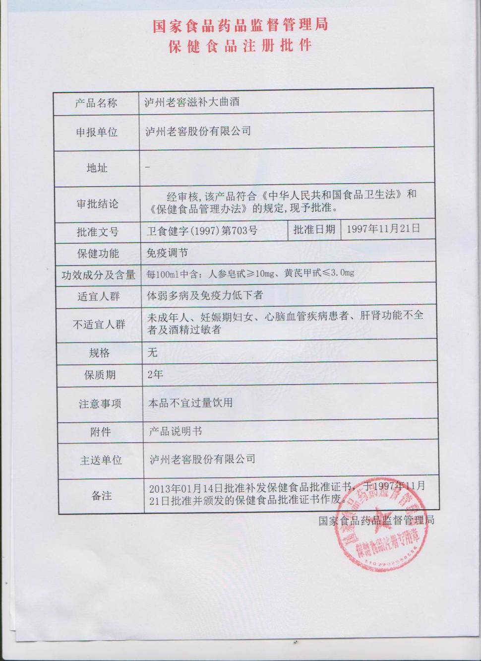 泸州老窖·滋补大曲酒沿用滋补酒古方,恢复1985年泸州老窖·滋补大曲酿造工艺,将古法酿制技艺与现代生物技术相结合,利用“靶向萃取工艺”提取人参、黄芪的有效活性成分:人参皂甙、黄芪甲甙,再按照“君臣佐使”的药用原则,以麦冬、当归辅助调味并反复配伍测试,最后通过上百种基酒的搭配测试、勾调,将其与醇香大曲酒完美融合。
