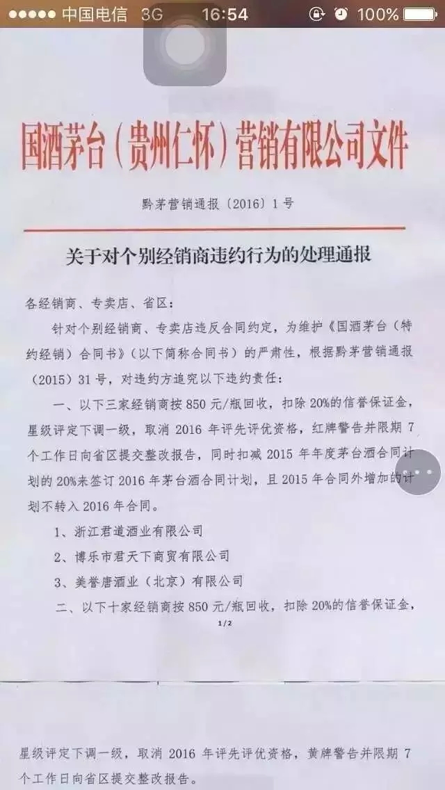 一、对下列三家经销商:5个工作日内按收购价基础上加价10%回购;取消承兑汇票的使用权,扣除20%的履约保证金,星级评定下调一级,取消2016年优先评优资格,黄牌警告并限期7个工作日向省区提交整改报告,同时扣减2016年年度茅台酒合同计划的20%。