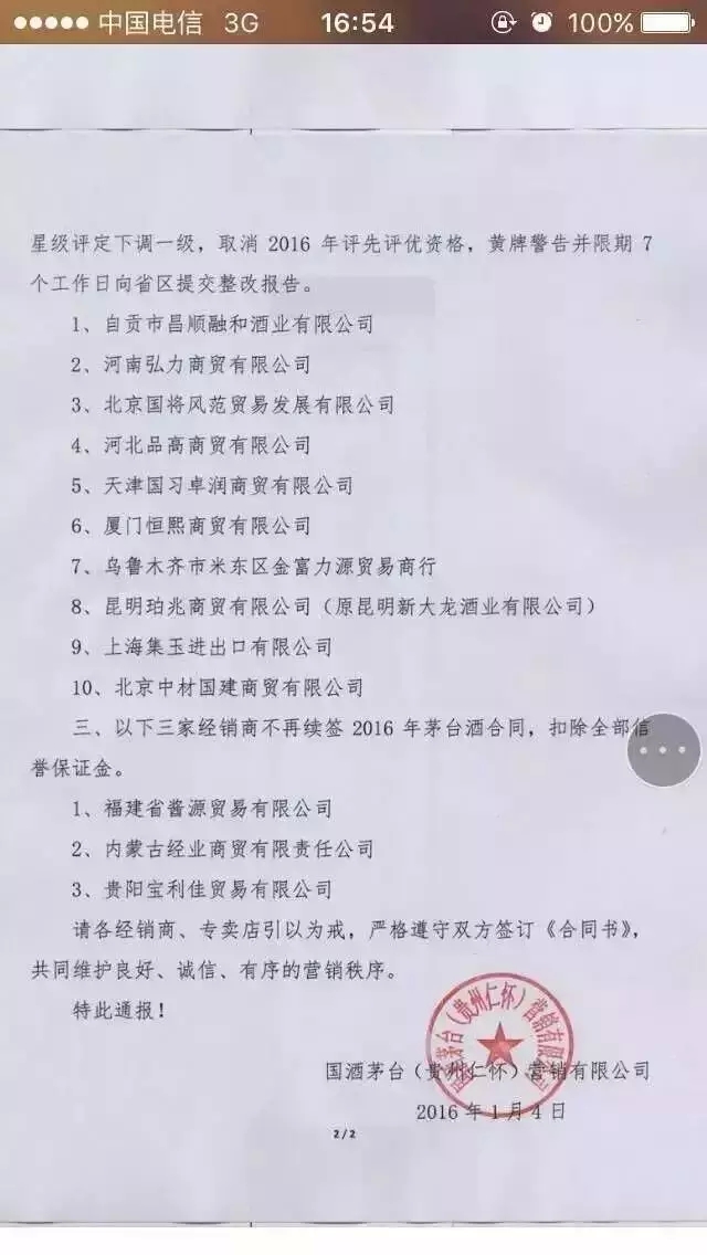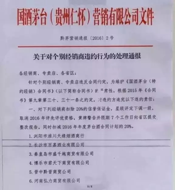 1月25日,国酒茅台(贵州仁怀)营销有限公司再次发布《关于对个别经销商违约行为的处理通报 》,针对个别违反合同约定的经销商、专卖店追究违约责任,具体处理情况如下: