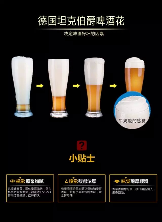 大多数的德国啤酒的酒花用的是雄花,而坦克伯爵啤酒的酒花可是来自德国巴伐利亚州著名的哈勒陶地区的高品质雌花,这就使得坦克伯爵啤酒具有圆润的口感,泡沫洁白细腻丰富,挂杯持久,收口清新怡人,形成麦芽香、酒花香独特苦味综合体的典型代表。