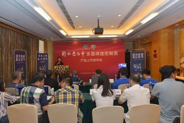 8月26日下午,永昌球迷定制酒产品上市发布会在石家庄万达洲际酒店举行。会上正式推出了衡水老白干永昌球迷定制酒。衡水老白干营销有限公司总经理赵旭东、石家庄永昌足球俱乐部副总经理任洪江、常务副总经理兼代理总教练李金羽、以及球员代表关震,石家庄市球迷协会秘书长郑杰,以及石家庄永昌的球迷代表等共同出席此次新闻发布会。